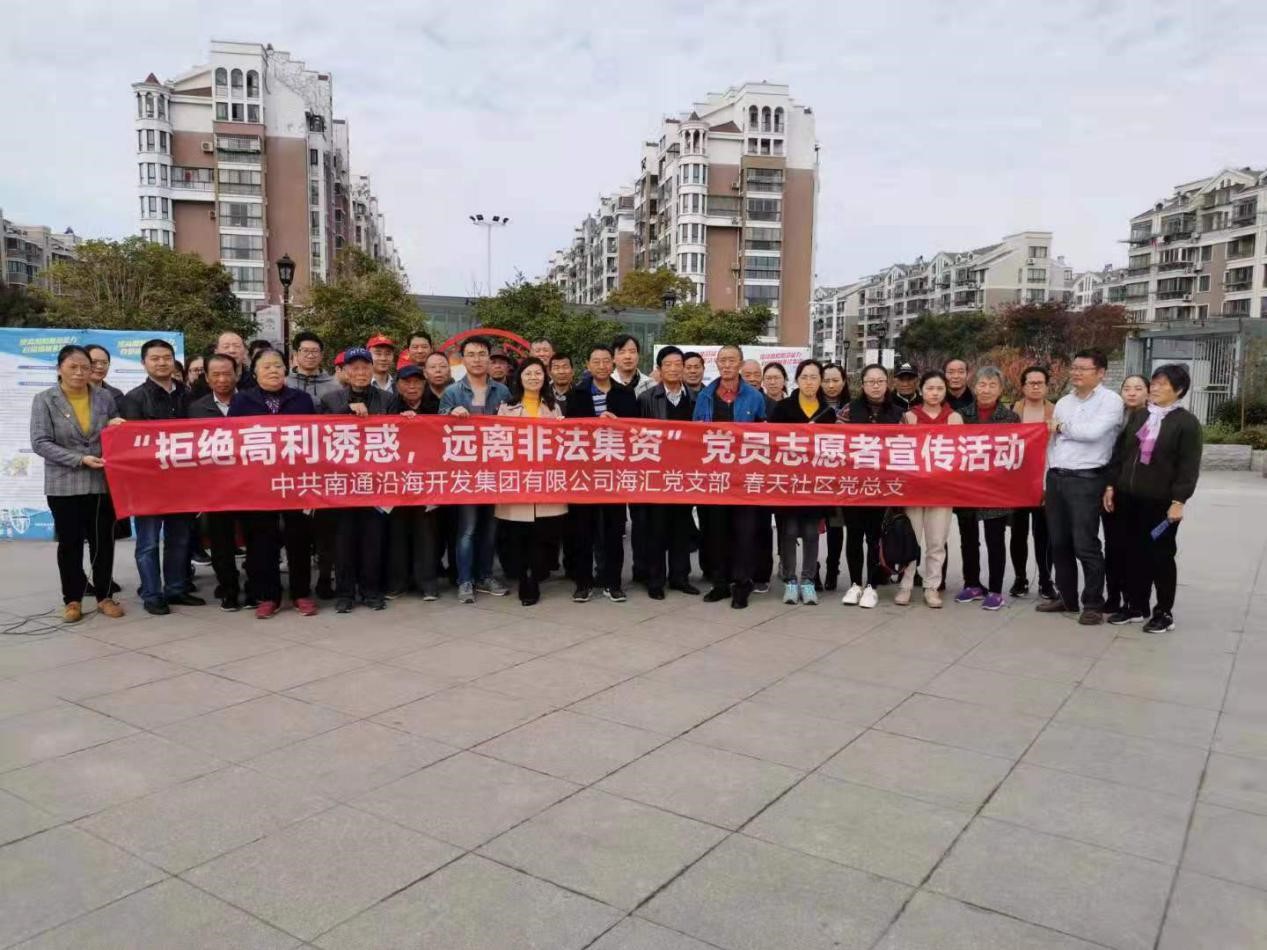 為進(jìn)一步貫徹落實(shí)集團(tuán)“不忘初心、牢記使命”主題教育工作部署,11月23日上午,海匯黨支部結(jié)合本月主題黨日活動(dòng),聯(lián)系工作實(shí)際,與開(kāi)發(fā)區(qū)春天社區(qū)黨總支聯(lián)合開(kāi)展以“拒絕高利誘惑,遠(yuǎn)離非法集資”為主題的志愿宣傳活動(dòng)。
